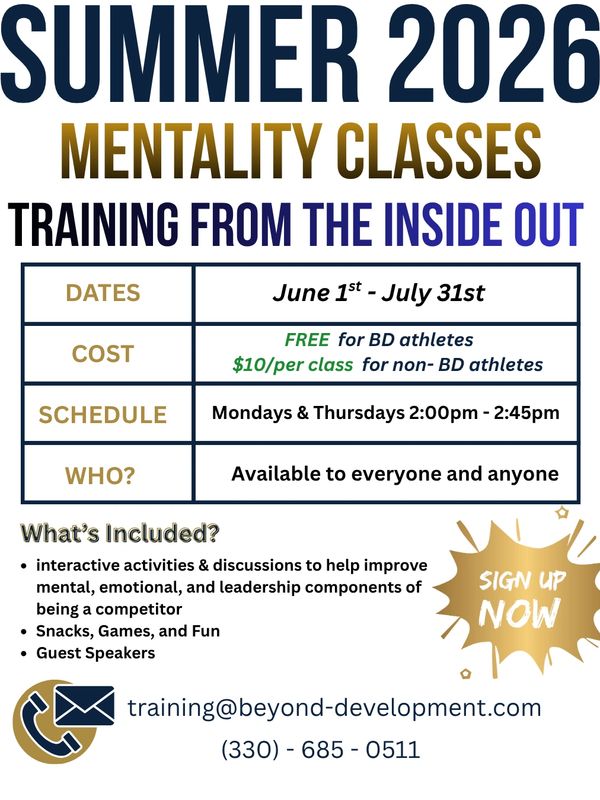 Start marking your calendars for Mentality Mondays and Thinking Thursdays at Beyond starting June 1st. This program includes interactive activities and discussions with athletes of all sports, ages, and levels used to help improve intangible skills. Classes will be fun and influential as athletes truly learn what it means to train from the inside out.